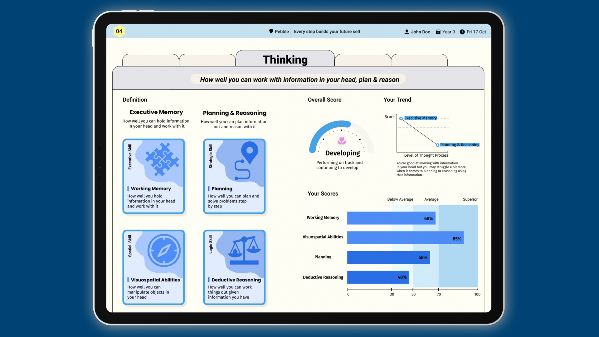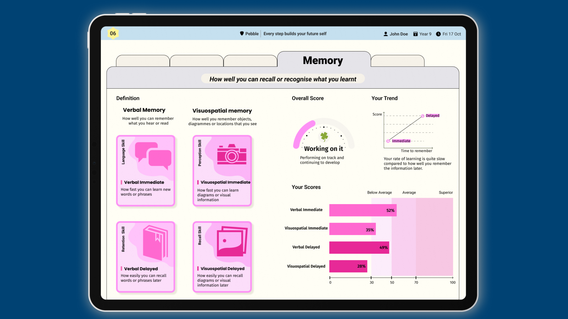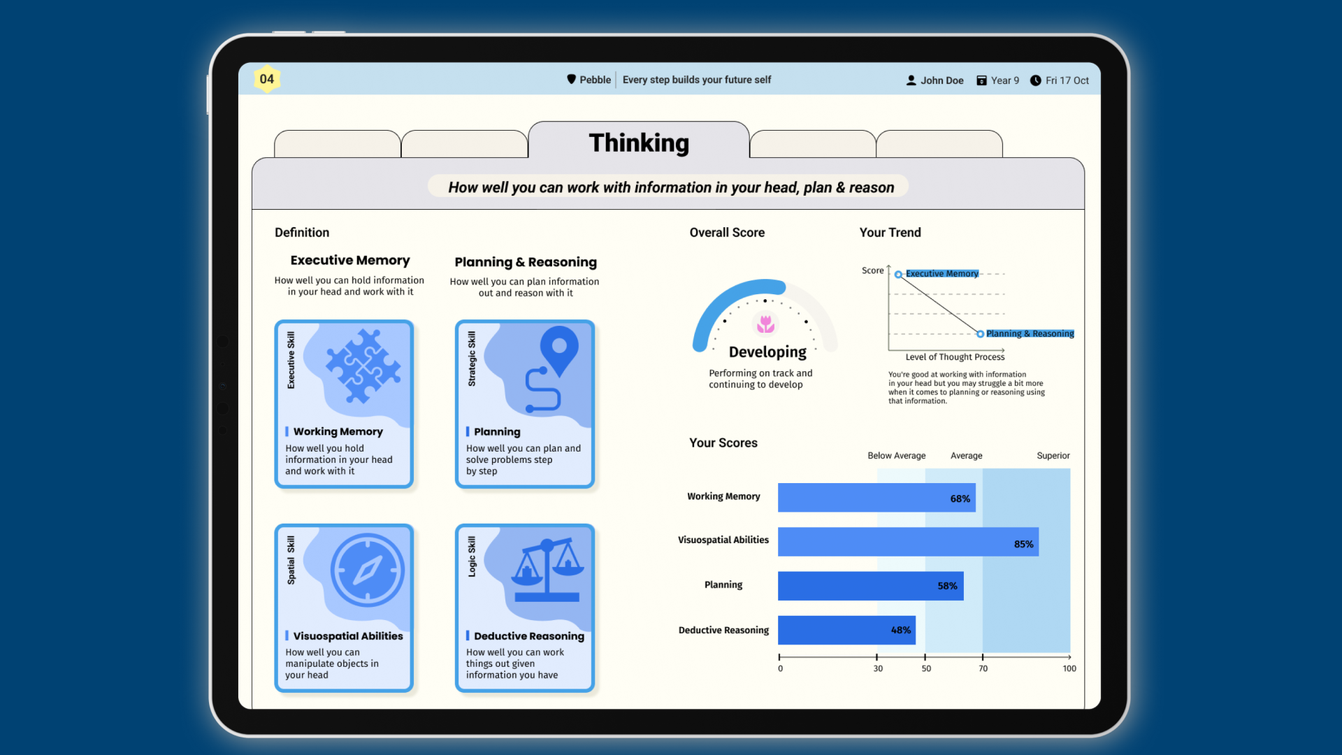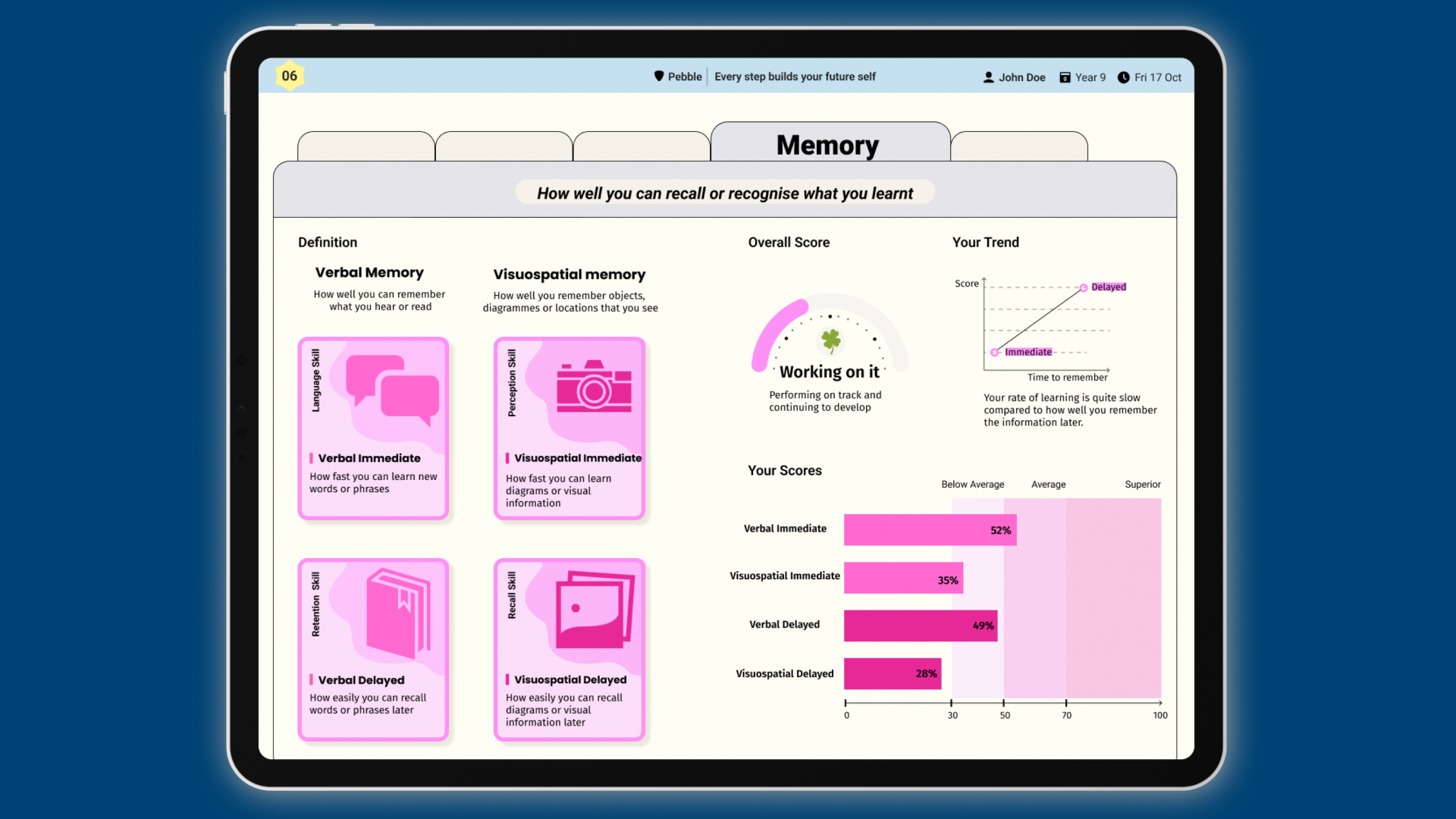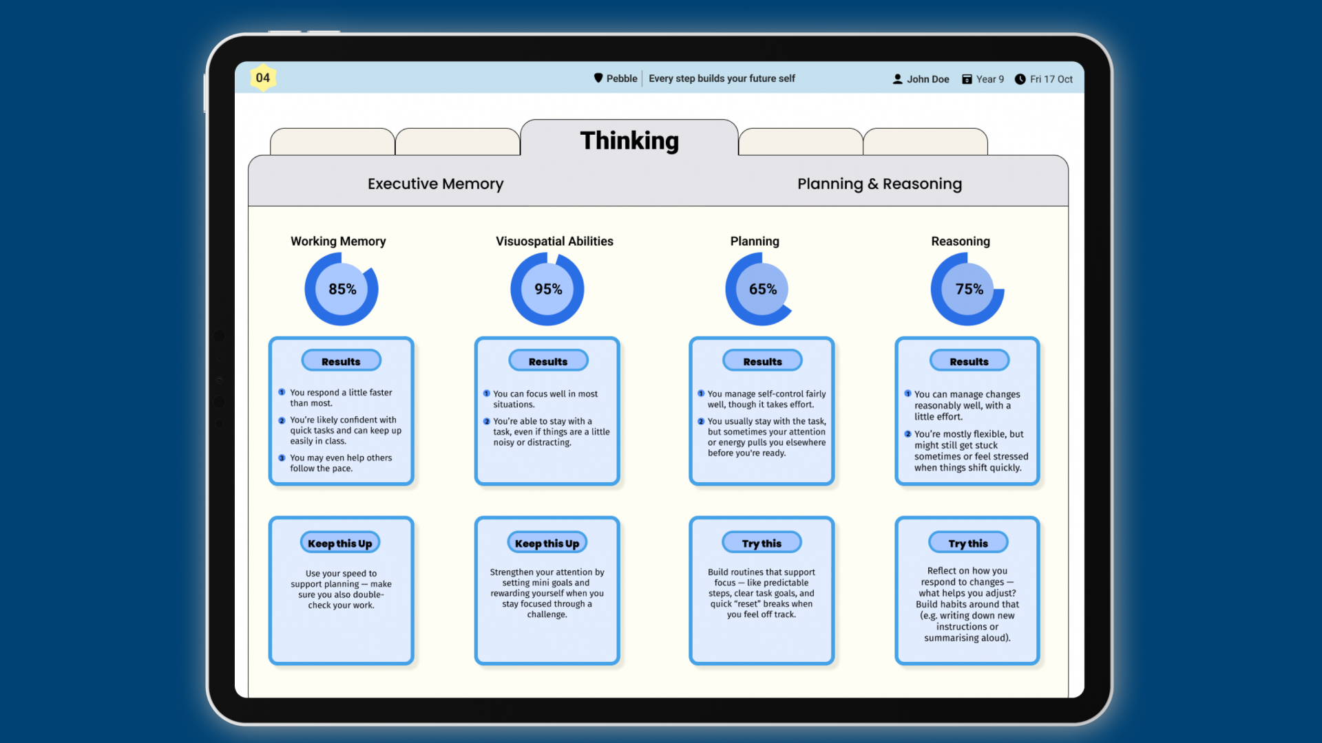 Pebble analyses response accuracy, speed and patterns to identify cognitive strengths and potential learning needs.