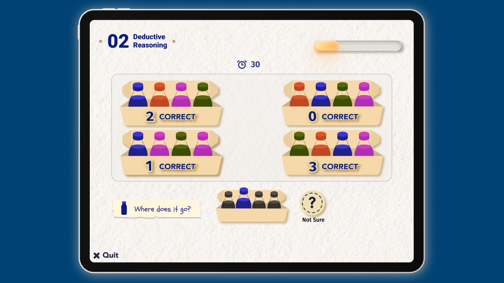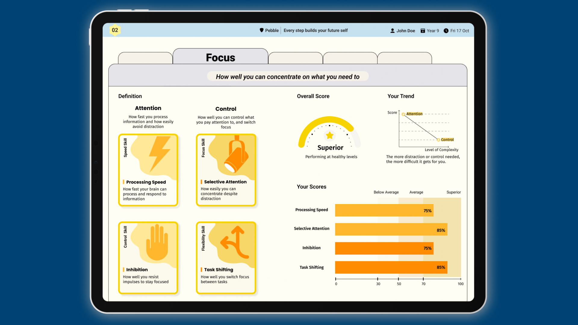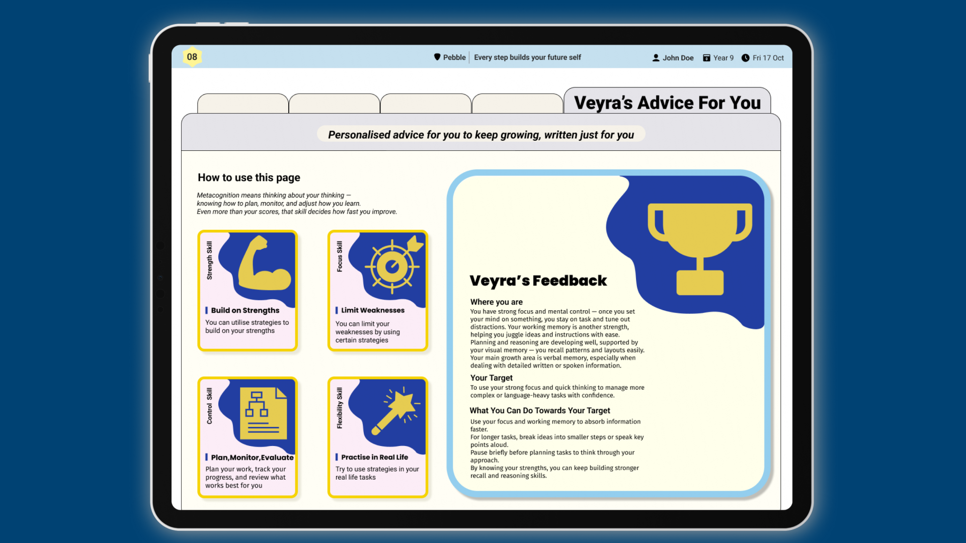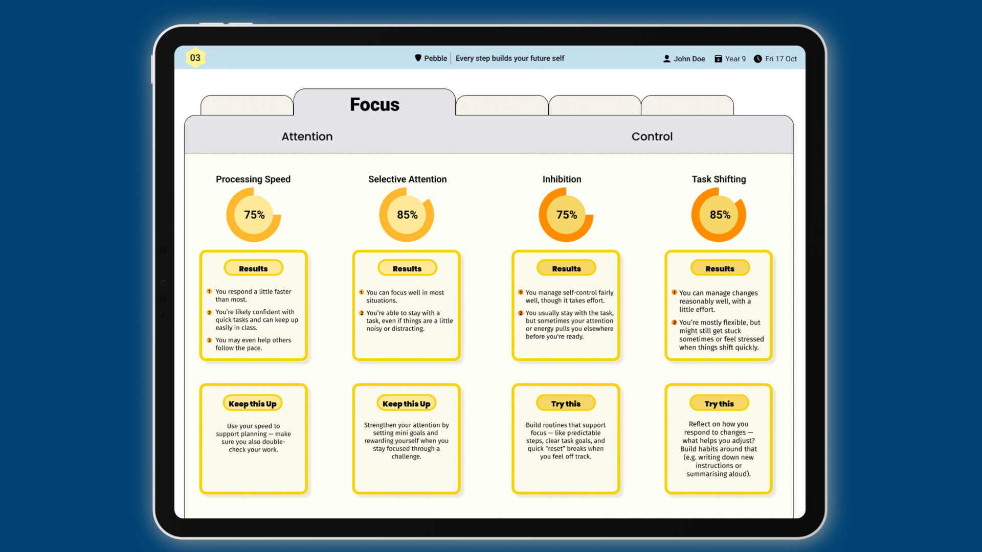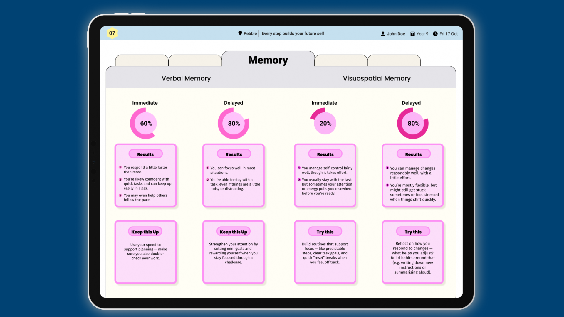 Pebble analyses response accuracy, speed and patterns to identify cognitive strengths and potential learning needs.